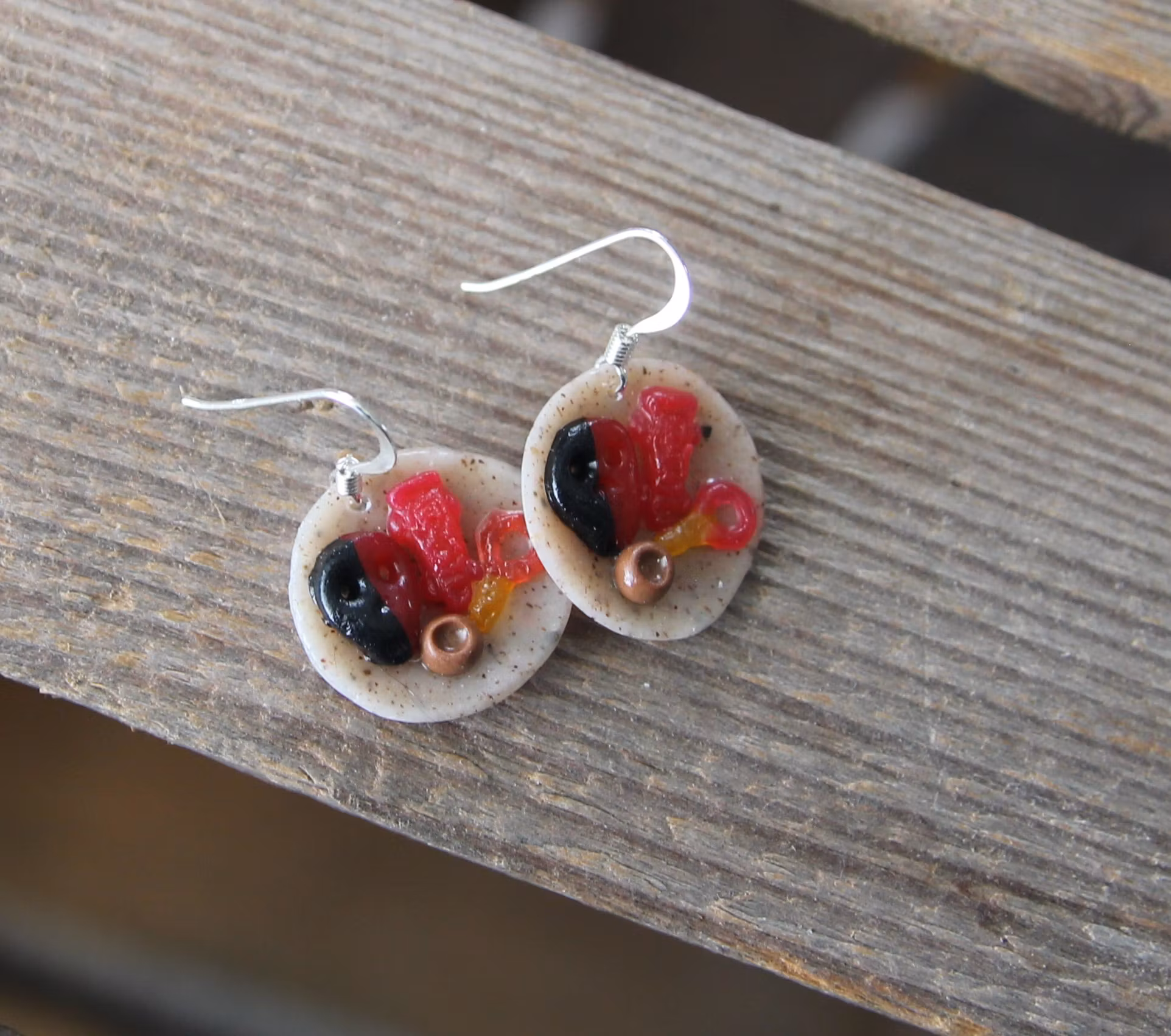 A pair of cute earrings with two blue coffee plates (a dammsugare, chocolate ball and cinnamon bun). Since each pair of earrings is unique, the ones you get may differ slightly from that pair in the pictures.