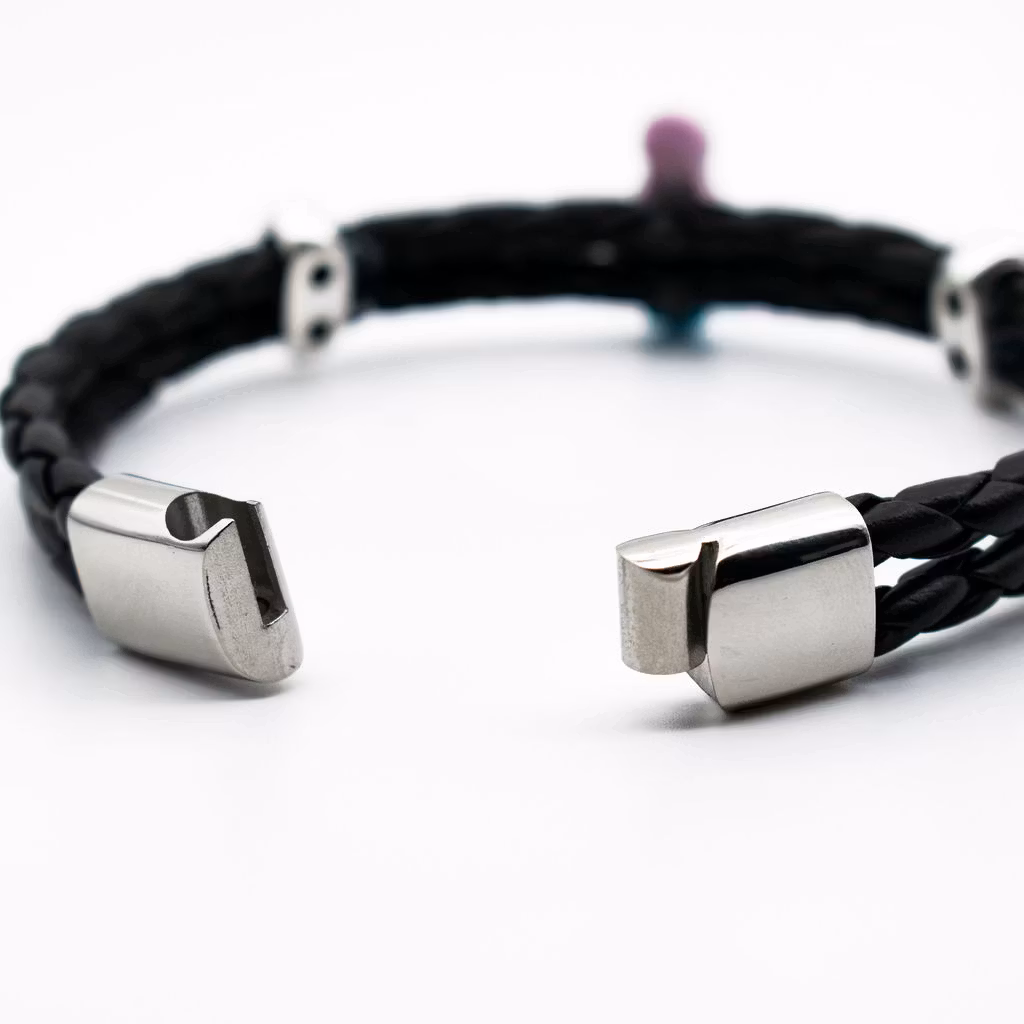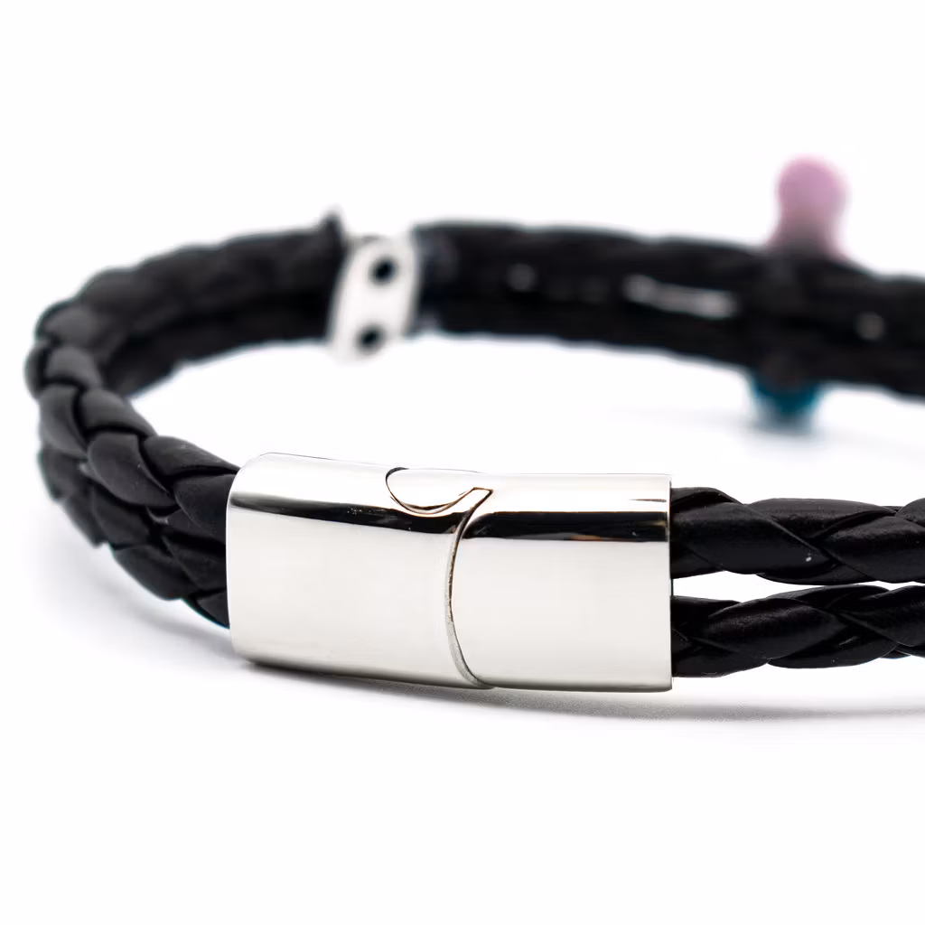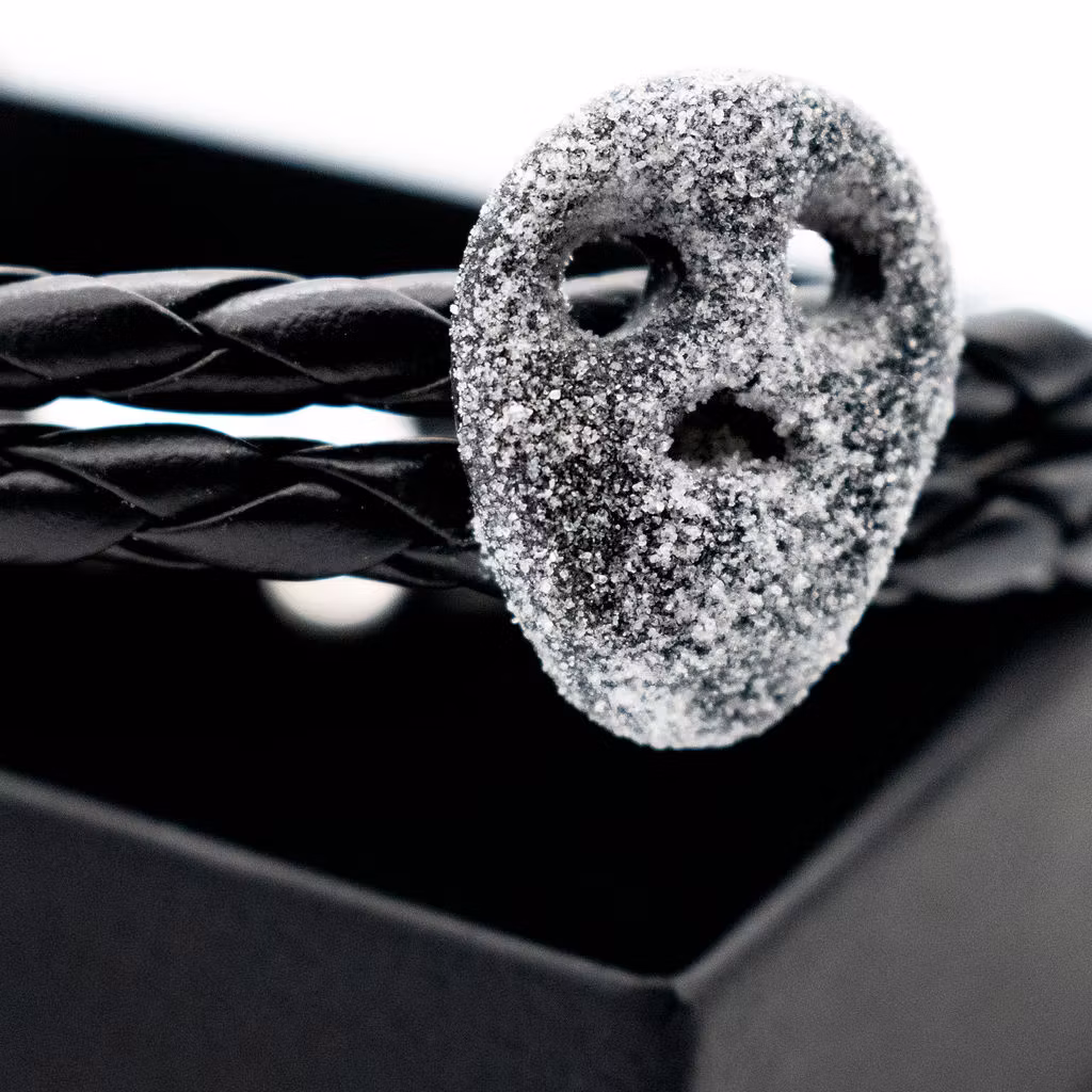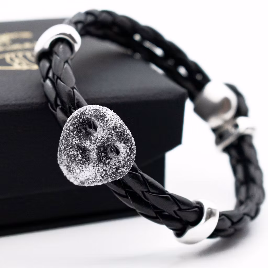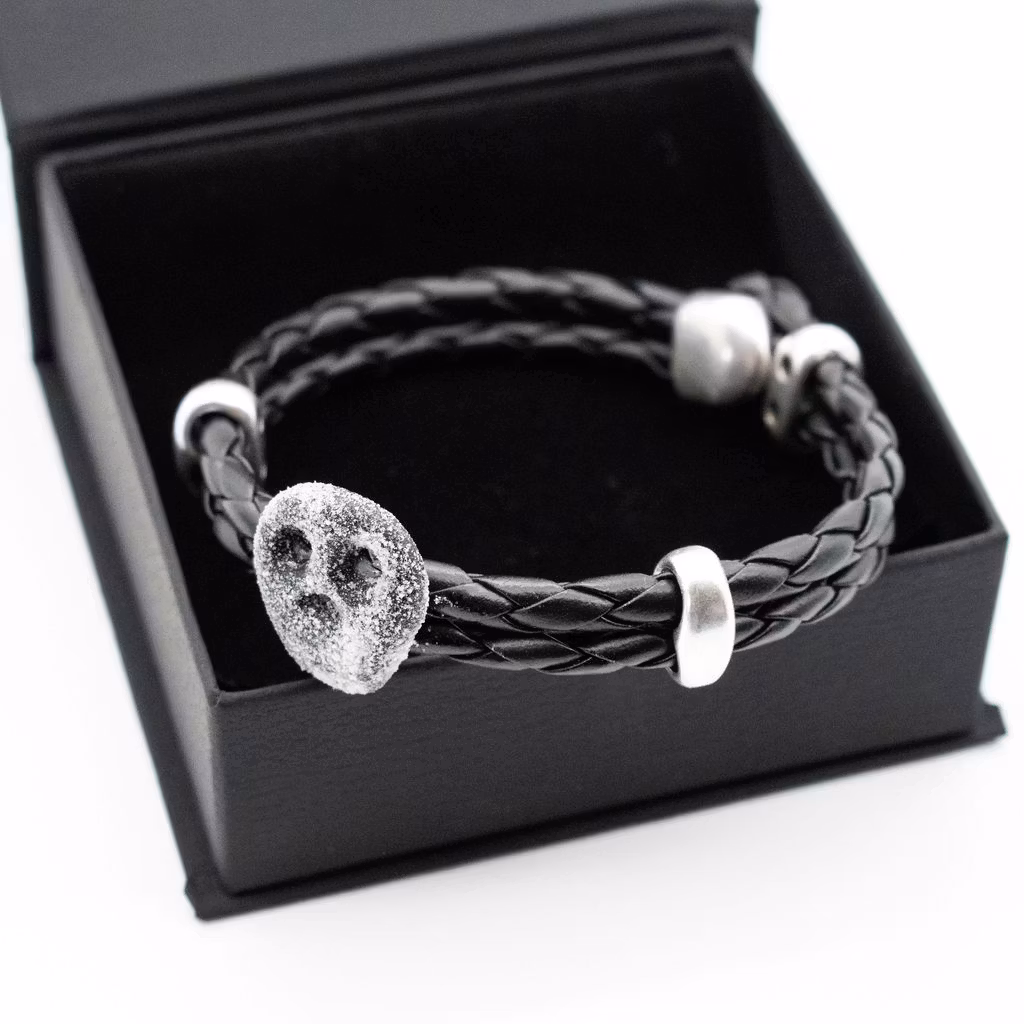 Lägg en beställning på ett herrarmband med en saltskalle. Remmen är av svart flätad PU-läderrem (konstläder) i hög kvalitet. Längd kan väljas mellan 19-21 cm. Armbandet är ca 1 cm brett.