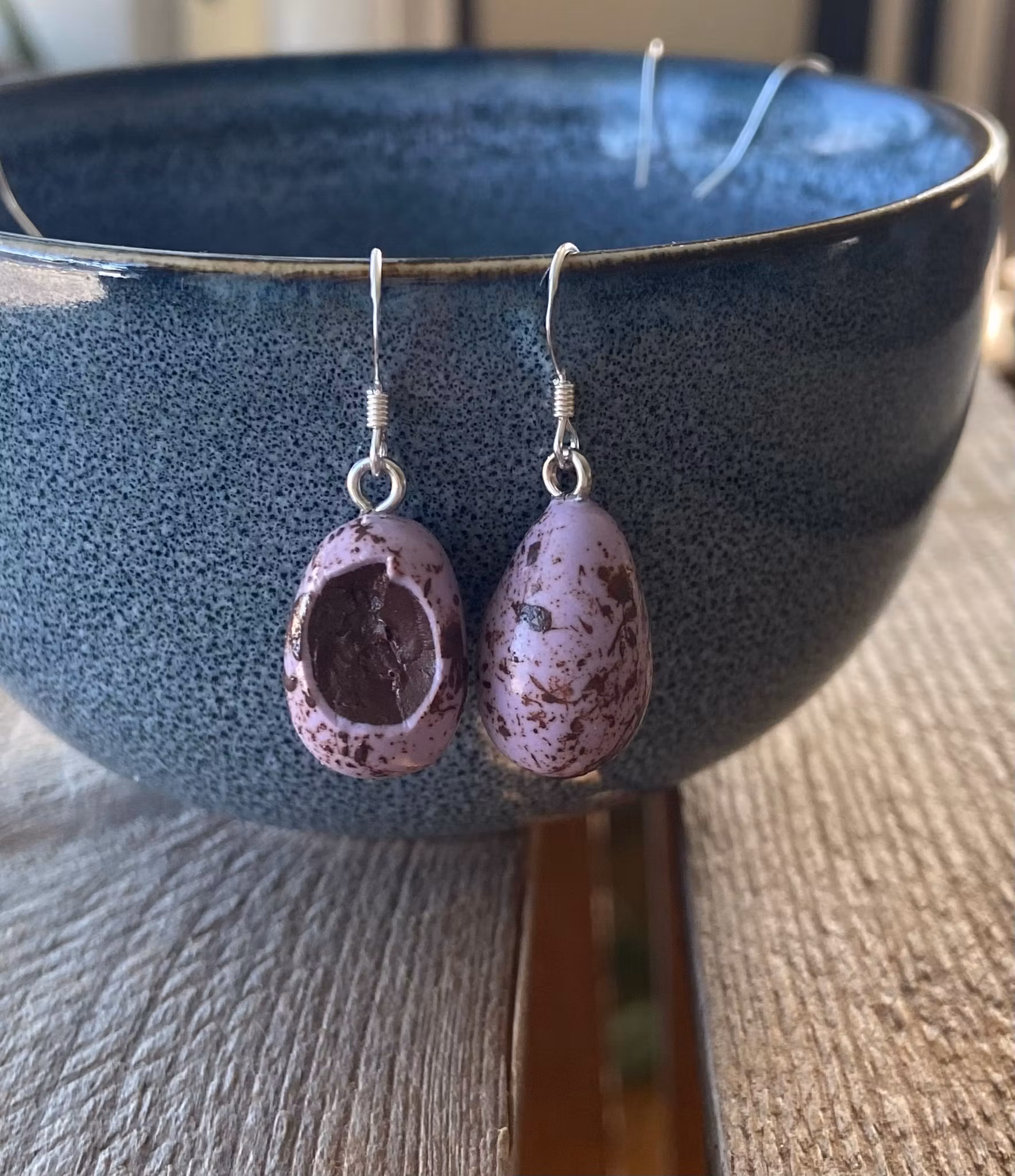 Ett par söta örhängen i form av lila chokladägg. Eftersom varje par örhänge är unika kan de du får skilja sig lite från det paret på bilderna.